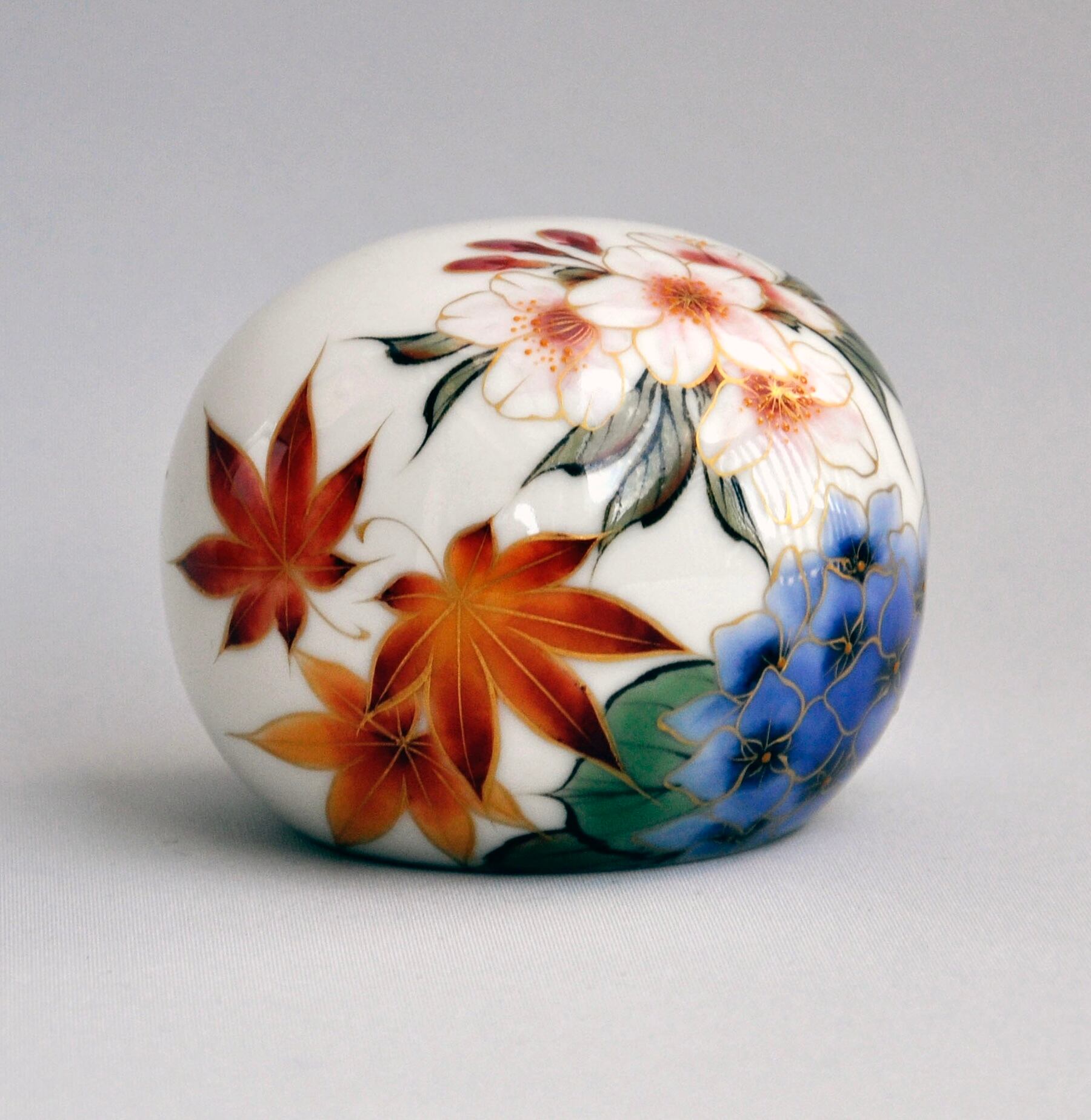 四季折々の花をちりばめた 手のひらに乗る 手元供養用分骨容器です 桜 紅葉 紫陽花 裏には梅の模様があります